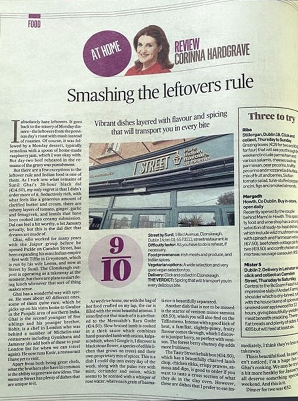Ghai, who worked for many years with the Jaipur group before he opened Pickle on Camden Street, has been expanding his mini Indian empire – first with Tiffin in Greystones, which is run by his wife Leena, and now at Street by Sunil. The Clonskeagh outpost is operating as a takeaway at the moment, but there are plans to start doing lunch whenever that sort of thing makes sense.